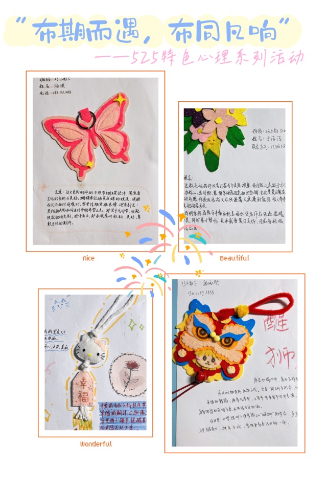 活动中,同学们化身“布艺魔法师”,以不织布为纸,剪刀作笔,针线为墨,精心裁剪、拼接、组合。珠子闪烁如星,亮片璀璨似光,在巧手下点缀出层次丰富的守御挂件。每一件作品都承载着独特创意:或是为挚友编织的暖心祝福,或是对生活的诗意诠释,旁侧的正能量话语更如春日暖阳,传递着向上的力量。线上交流的氛围里,灵感碰撞,创意纷飞,一件件饱含心意的作品,成为美育与情感的生动载体。