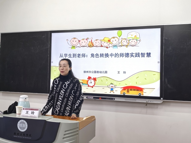 2025年10月15日下午在东校区求真楼111教室,特别邀请到在教育领域有着丰富经验和深刻见解的徐州市公园巷幼儿园德育主任王玲老师,为我院师生做了题为“从学生到教师:角色转换中的师德实践智慧”的精彩讲座。讲座由李冬香学术副院长主持,有60多位师生聆听讲座,他们当中既有对未来教师职业充满憧憬的师范专业学生,也有不断探索与成长的青年教师。