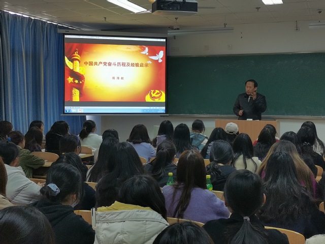 周老师深刻剖析了中国共产党诞生开天辟地大事变的历史背景,深情讲解了新中国建立的血与火的浴血奋战历程中那些可歌可泣的感人事迹,回顾了改革开放勇于革新的奋斗精神,展示了党的十八大以来励精图治、奋发图强所取得历史性成就、发生历史性变革,特别是战胜新冠疫情的伟大胜利、脱贫攻坚的伟大成就,为同学们全景式展开中国共产党百年砥砺奋进、从胜利走向胜利的历史画卷,深刻揭示了没有共产党就没有新中国,只有马克思主义能够救中国的道理,热情讴歌了在一百年的非凡奋斗历程中涌现出来的一代又一代、一批又一批视死如归的革命烈士、顽强奋斗的英雄人物、忘我奉献的先进模范的光辉事迹所彰显的伟大精神和构筑起的中国共产党人的精神谱系,有力证明了我们党的百年历史就是一部践行党的初心使命的历史,就是一部党与人民心连心、同呼吸、共命运的历史。