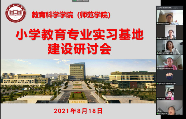 为进一步优化小学教育专业人才培养过程,提高人才培养质量,加强实习基地建设,我院于2021年8月18日上午9:30采用线上腾讯会议的方式召开小学教育专业实习基地建设工作研讨会。徐州市解放路教育集团云苑路等11所小学的校长或教导处主任参加研讨会,我校教务处石端虎副处长、教育科学学院耿中华书记、马衍院长、李先刚副书记、张典兵副院长、周红副院长、小学教育专业负责人王坤教授和小学教育教研室全体教师参加了会议。会议由张典兵副院长主持。