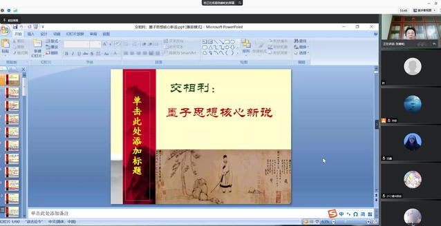 张峰屹教授讲座的题目是《“交相利”:墨子思想核心新说》。讲座从熟悉先秦两汉时期相关史料中对墨学评述中的引入,进而介绍了墨子其人及其思想的评价。张峰屹教授主要讲解了长久以来,学人大都认定“兼爱”、“非攻”是墨子的核心思想。他强调“兼爱”、“非攻”只是墨子实现其核心思想的方式或路径。他指出墨子的思想核心是“交相利”,也就是“互利”。张教授梳理了墨子十条思想纲领,虽基于不同的社会现实,但都以“互利”为出发点和目的地进行了分析,论证了“交互利”是墨子思想的核心。张峰屹教授阐释了墨子以“交相利”为核心,构建了一个比较严整的社会思想和政治思想体系。他特别强调应以“非命”“尚同”“节用”“非攻”“兼爱”为各个支点对现代社会的启示做以思考。