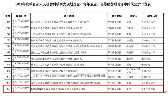 近日,教育部社科司公示了2024年度教育部人文社会科学研究项目评审结果,我院小学教育教研室庄妍老师申报的“IMV模型视域下青少年自杀的影响机制与预防体系构建”课题成功获批青年基金项目。