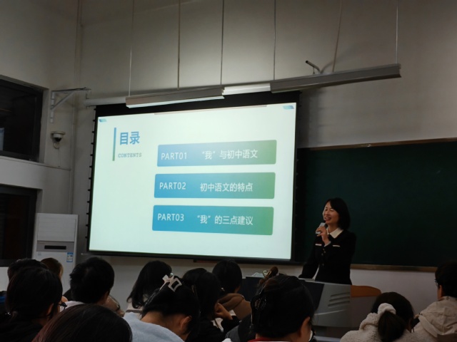 戚校长的讲座从自己作为语文教师成长的三个阶段开始,讲述了自己从立志做一名优秀语文教师,借力科研推动语文教学水平、能力不断提升中,逐渐成长为区域的教学名师。她鼓励同学们要牢固确立立德树人根本任务,及时关注初中语文教学内容、形式的新变化,深入理解、领会、执行新课标,钻研新课标,“依标施教”,争取早日从准教师向“优秀”的新教师转变。最后,戚校长以教育家于漪老师的话作为结尾,向同学们提出三点衷心的建议:牢记教师使命责任;积累深厚的语文学科基础;做有深度、能创新的语文老师。