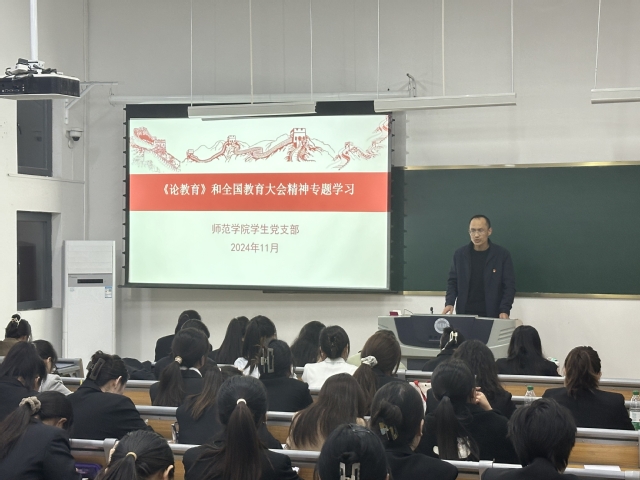 为了深入学习领会习近平同志《论教育》的重要论述和全国教育大会精神,深刻领会其时代背景、科学体系、精神实质和实践要求,学生党支部于11月15日在求真楼214开展了专题党课学习,全体学生党员参加。