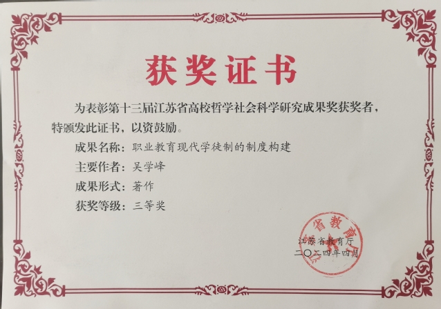 第十三届江苏省高校哲学社会科学研究成果奖评选结果揭晓,我院吴学峰副教授的著作《职业教育现代学徒制的制度构建》荣获三等奖,这是我院在哲学社会科学领域取得的又一重要荣誉。