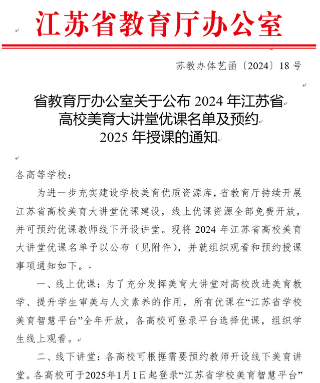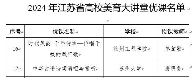 日前,江苏省教育厅公布了《省教育厅办公室关于公布2024年江苏省高校美育大讲堂优课名单及预约2025年授课的通知》(苏教办体艺函〔2024〕18号),我院音乐系单莺歌老师申报的《时代凤韵 千年传承——传唱千载的凤阳歌》成功获批优课,并在“江苏省学校美育智慧平台”2025年全年开放,各高校可登录平台选择优课,组织学生线上观看。