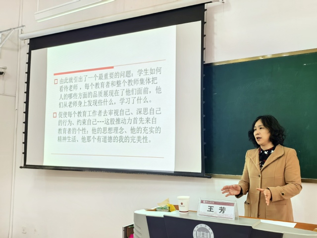 讲座伊始,王芳院长以“师德师风建设”为核心,阐述了其内涵。她结合《中小学教师职业道德规范(2008年修订)》和《新时代中小学教师职业行为十项准则》,强调“师德是教师的灵魂”,并引用教育家苏霍姆林斯基等名人名言,引发师生对师德价值的深入思考。她提出,教师需以高尚的品格、敬业的态度和无私的奉献精神为学生树立榜样,并反问:“学生从教师身上发现、学习到了什么?”这一叩问直击教育本质,引发在场师生的共鸣。